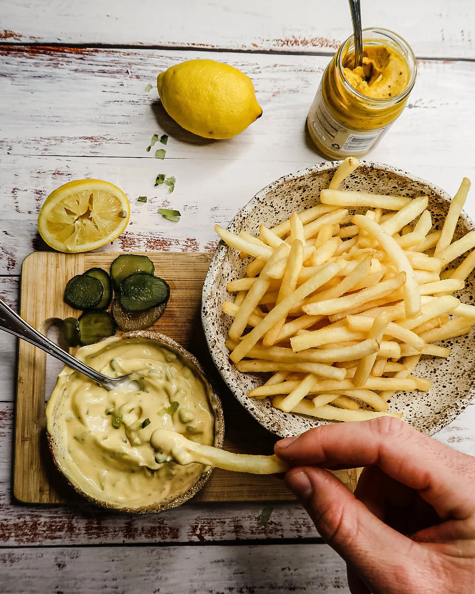 Nothing screams summer holidays, or Saturday nights in, or lazy Sunday afternoons more than hot chips with tartare sauce. This dairy free version is so so easy, and packs a lot of punch, with the fresh gherkins and squeeze of lemon giving a little zesty hit to the chips. Play and mix up your quantities to find the perfect balance for your palette. Warning though, this sauce may make you grab handfuls more than you intended, is that a bad thing though? I say no, grab away.