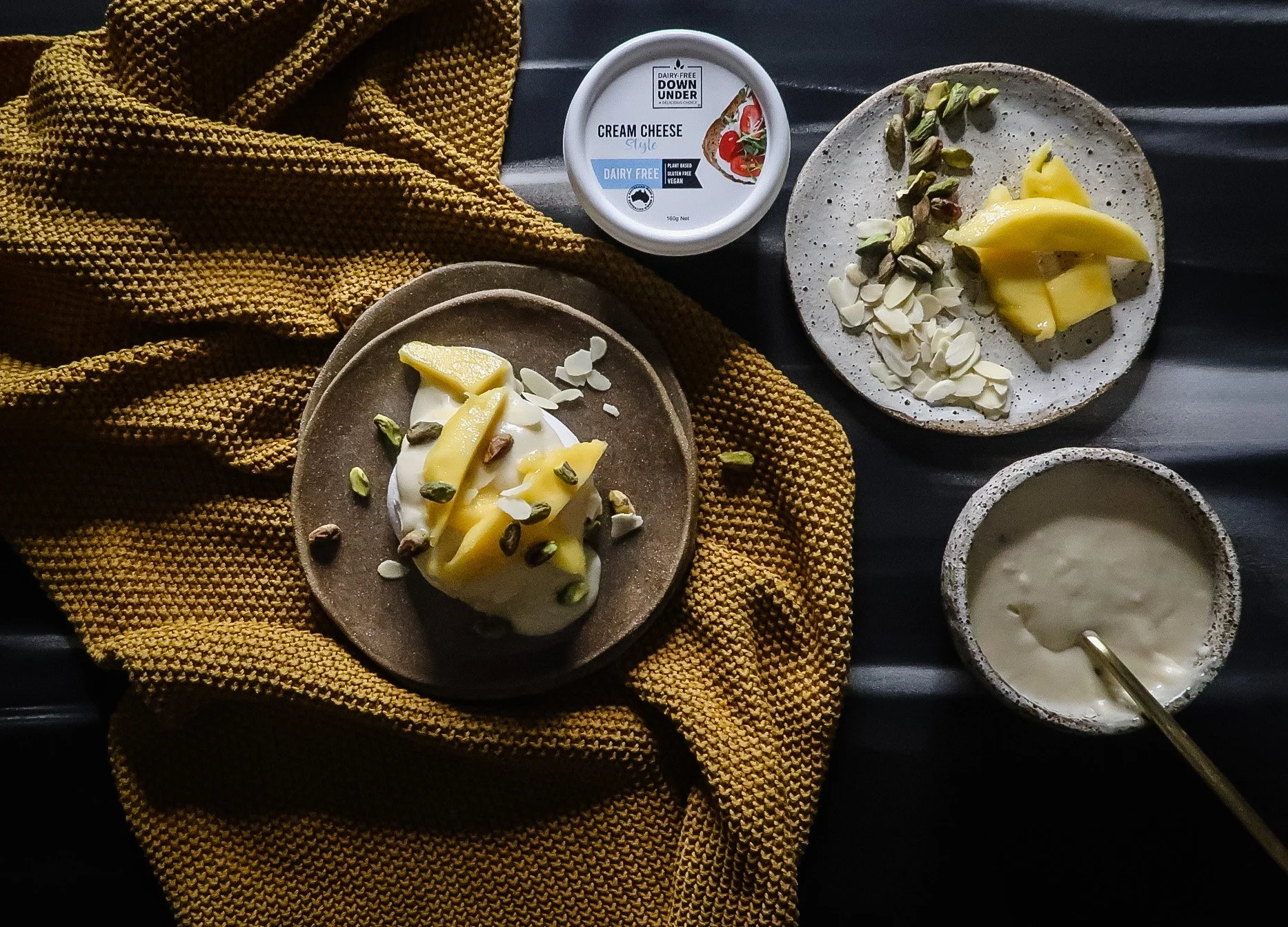 Step 8 The next day (or 4 hours later), dollop the dairy free cream cheese mixture over meringues and scatter with fresh mango, pistachios, coconut flakes